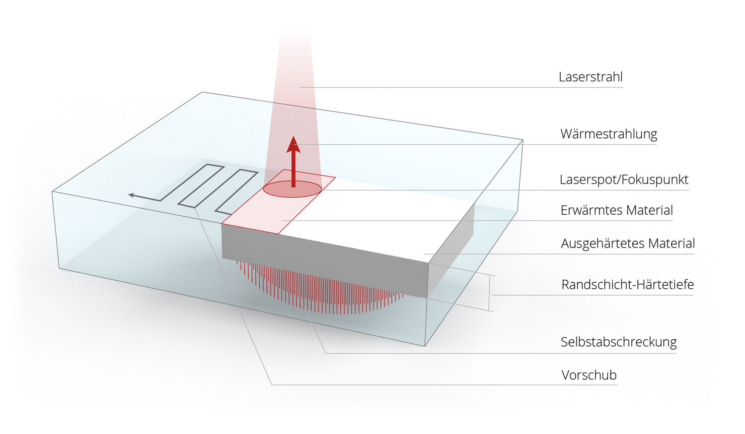 Der Laserstrahl erwärmt die Oberfläche punktuell fast bis zur Schmelztemperatur, wodurch die Gefügeumwandlung angeregt wird. Während die Laseranlage den Fokuspunkt (kann auch als Linie ausgelegt sein) weiter über die Oberfläche des Teils bewegt, wird die Hitze über das Grundmaterial des Werkstücks abgeleitet und die Abschreckung erfolgt „von selbst“.